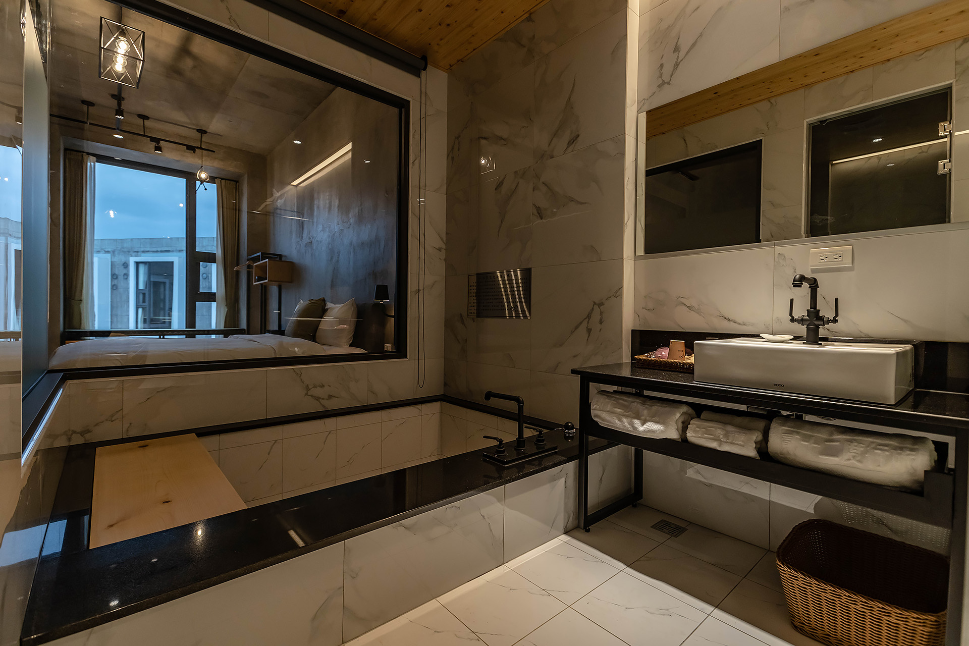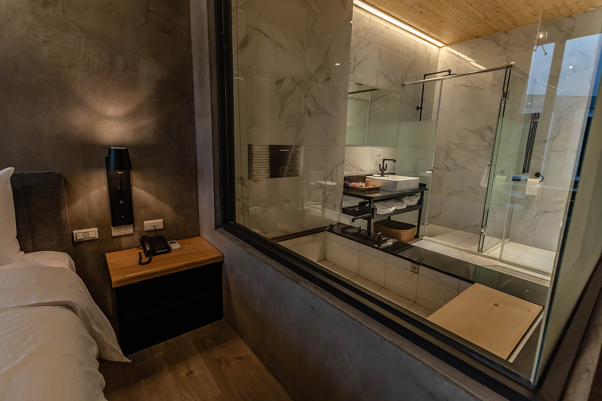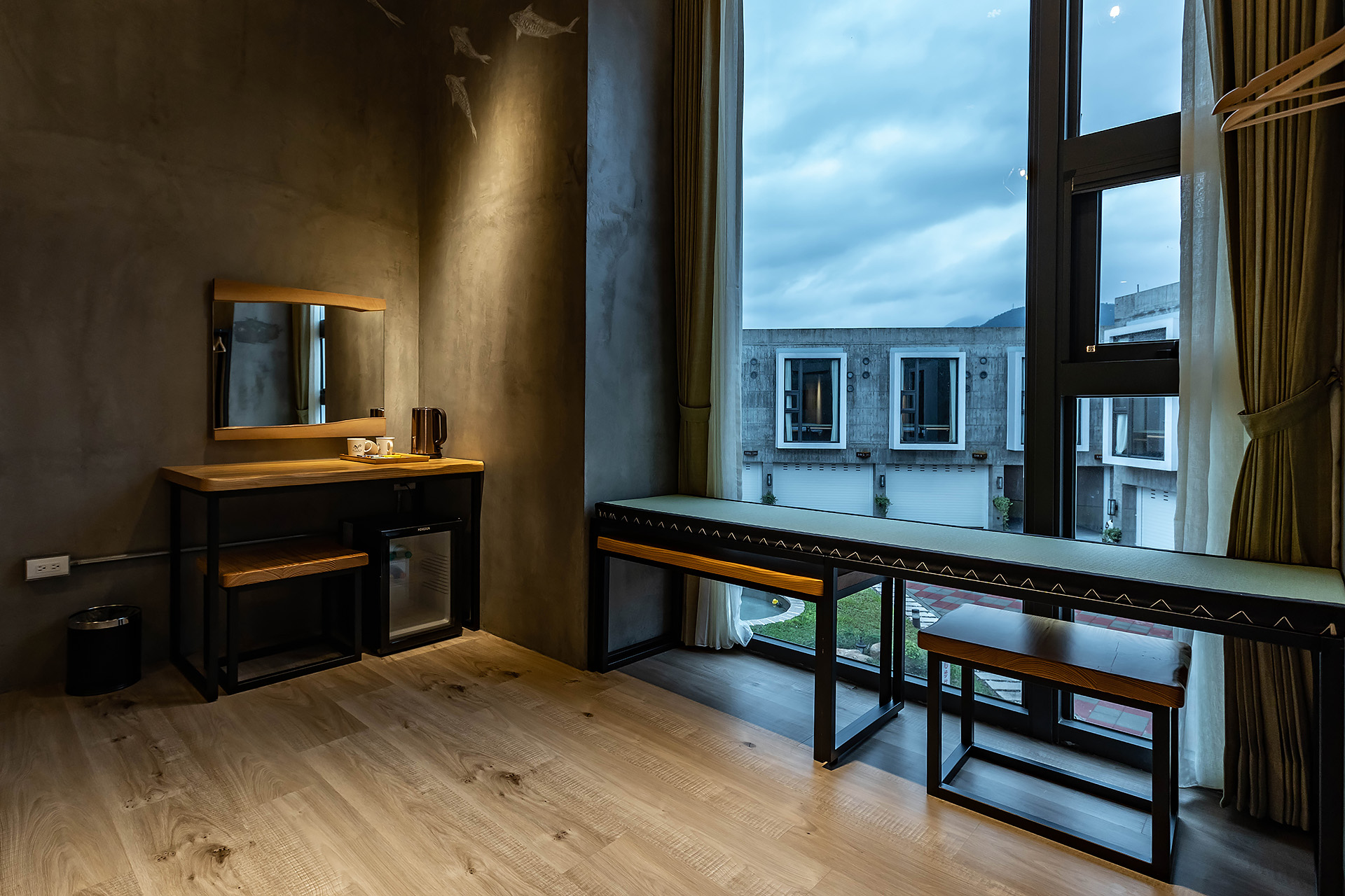獨立冷泉浴池、乾濕分離衛浴、無視界空間設計、一張QUEEN SIZE雙人床、大型景觀窗、清水模日式工業風設計風格、塌塌米窗邊椅、冷暖空調、一樓獨立車庫。