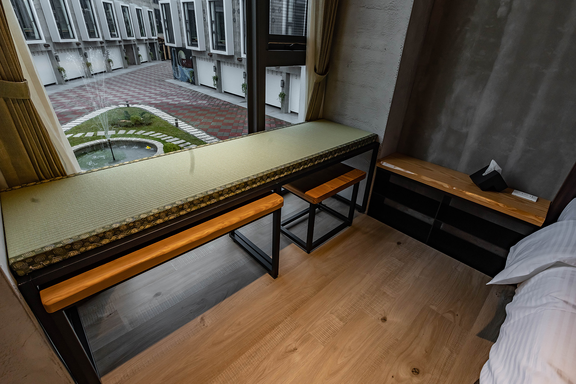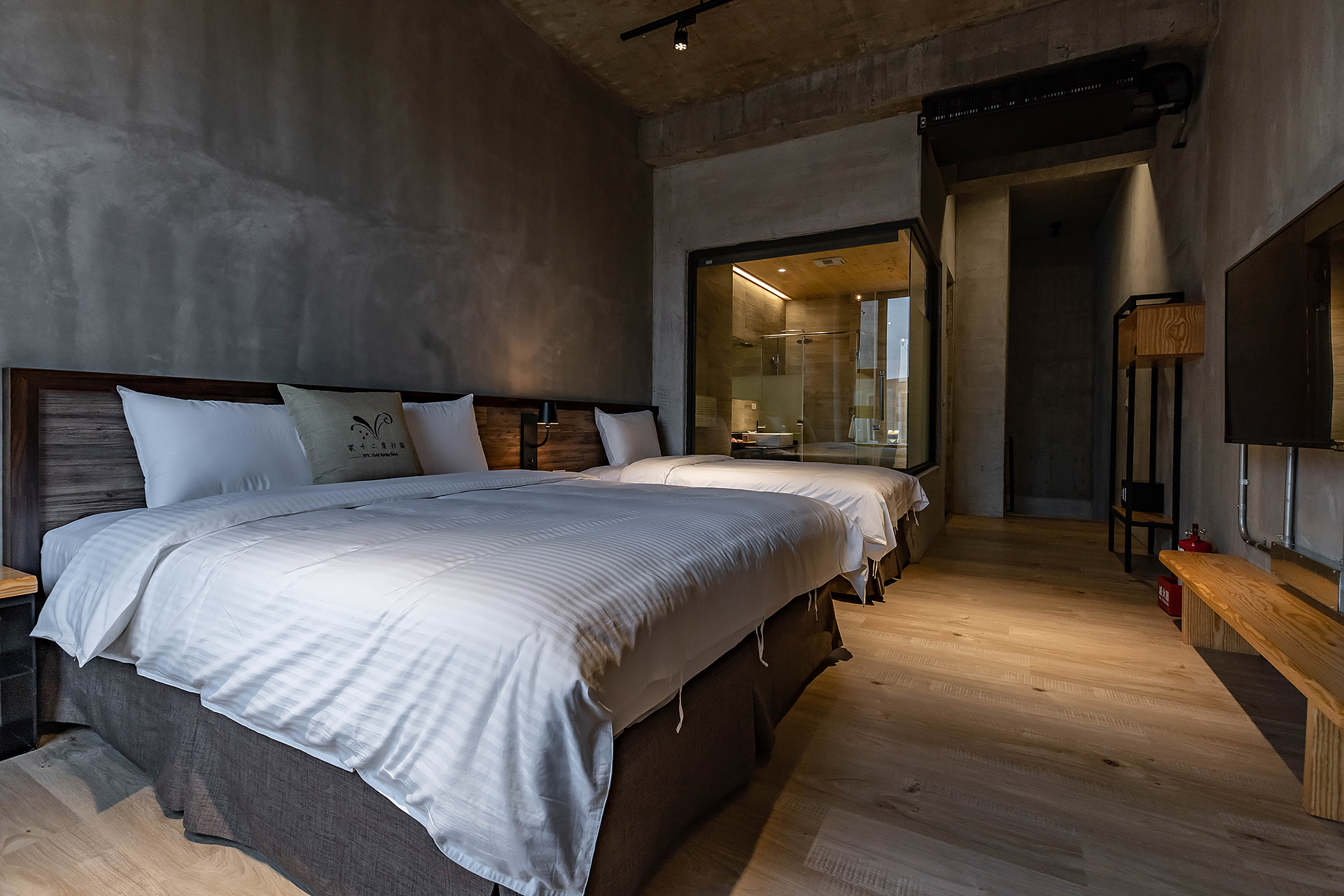 全尺寸獨立冷泉浴池、乾濕分離衛浴、一張QUEEN SIZE雙人床+一單人床、大型景觀窗、清水模日式工業風設計風格、塌塌米窗邊椅、冷暖空調、一樓獨立車庫。