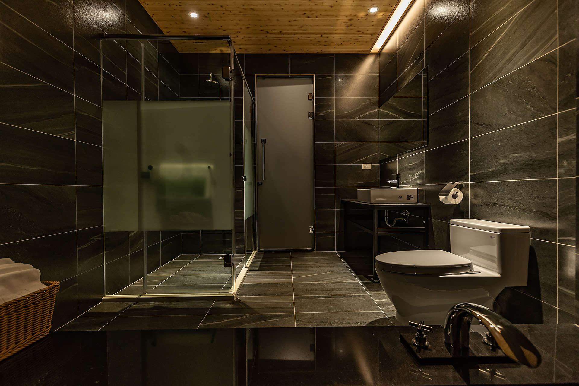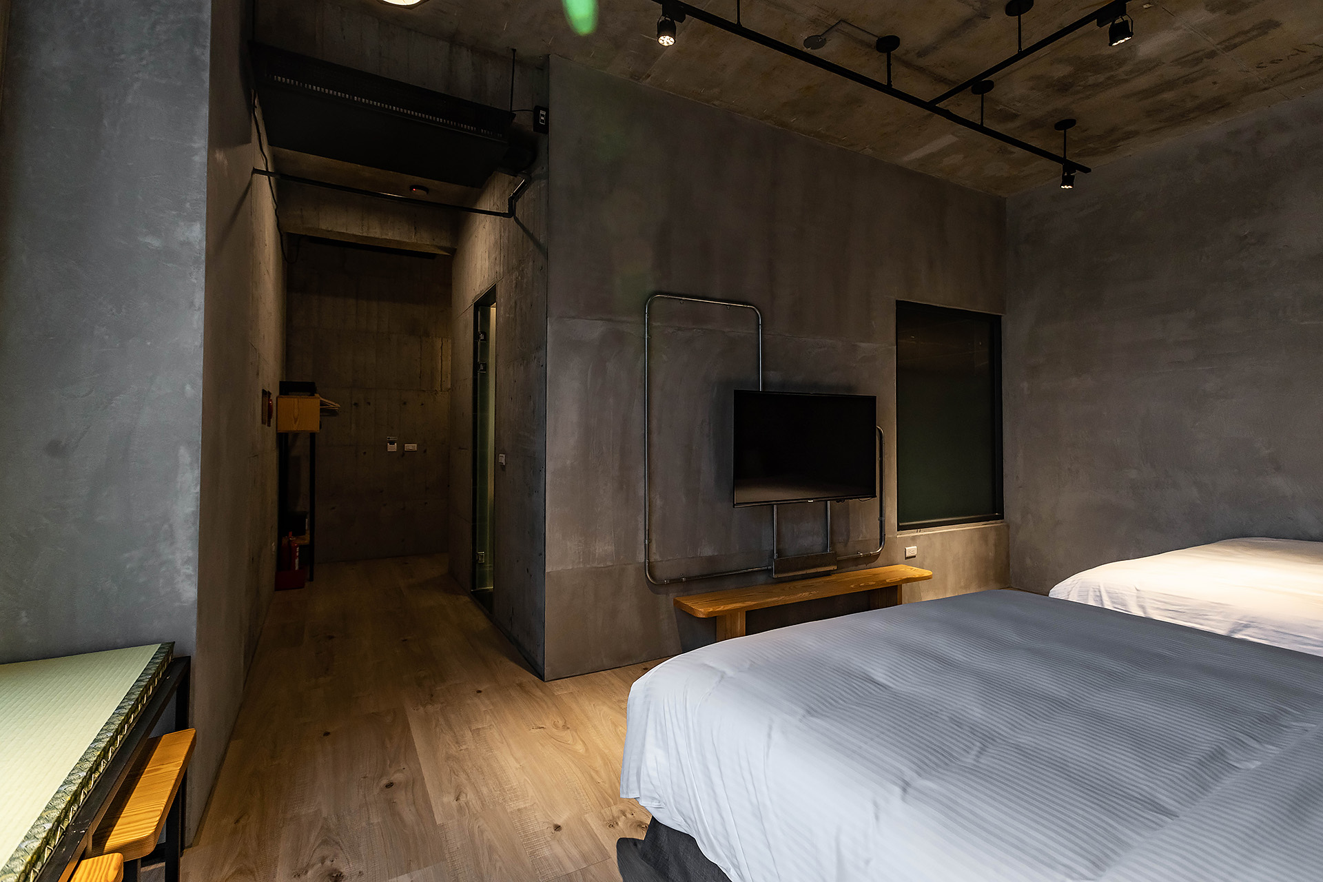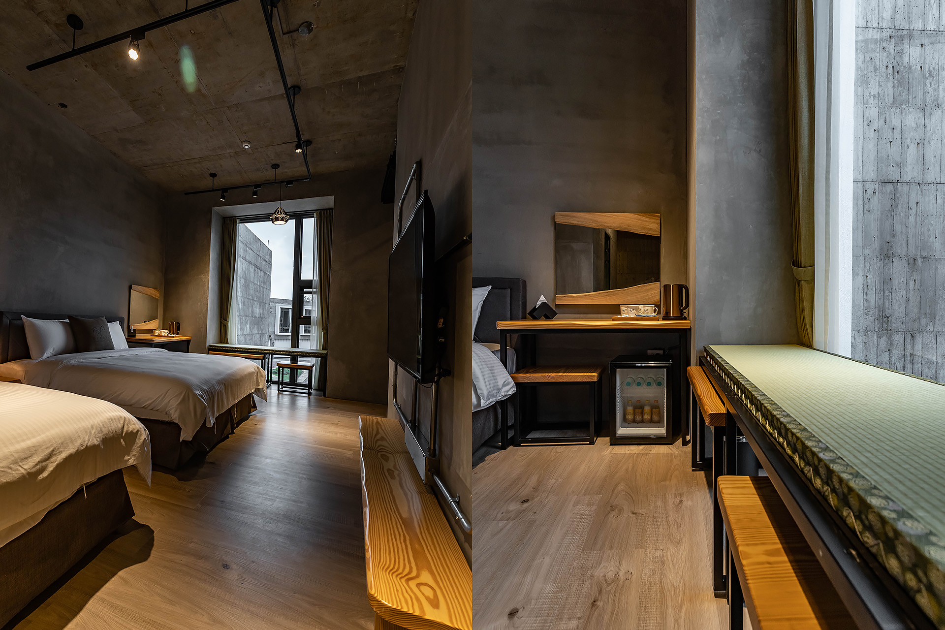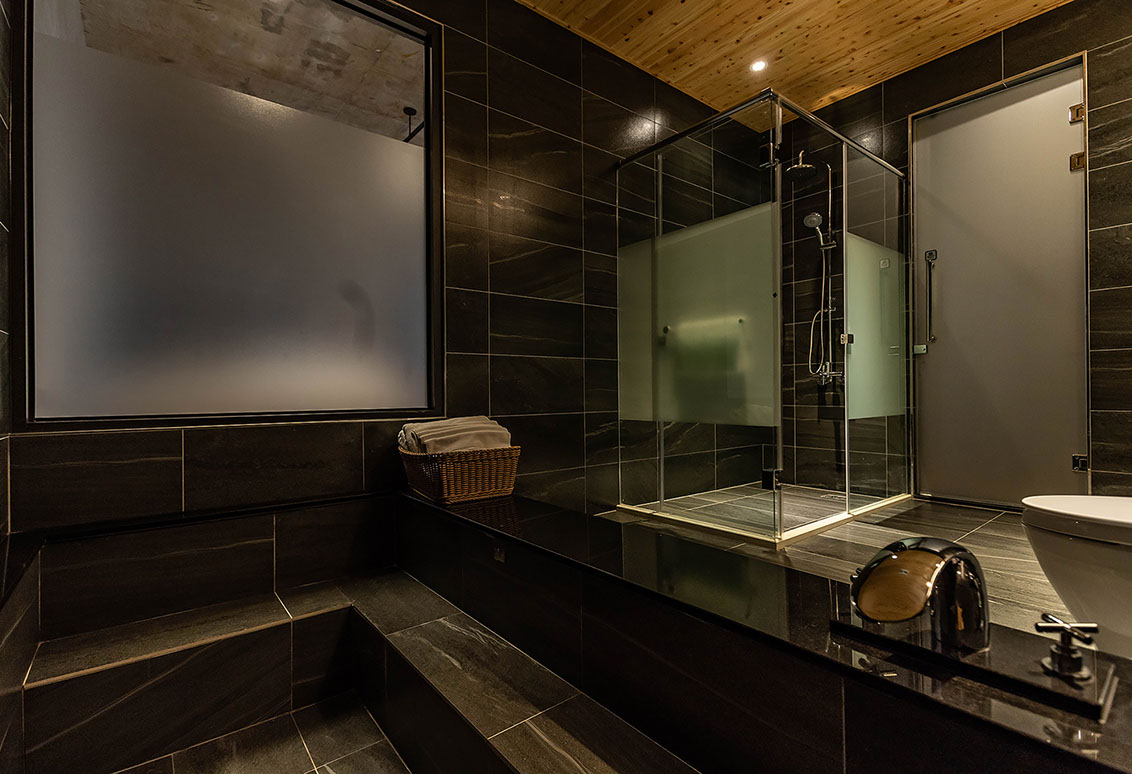 全尺寸獨立冷泉浴池、乾濕分離衛浴、無視界空間設計、兩張QUEEN SIZE雙人床、大型景觀窗、清水模日式工業風設計風格、塌塌米窗邊椅、冷暖空調、一樓獨立車庫。